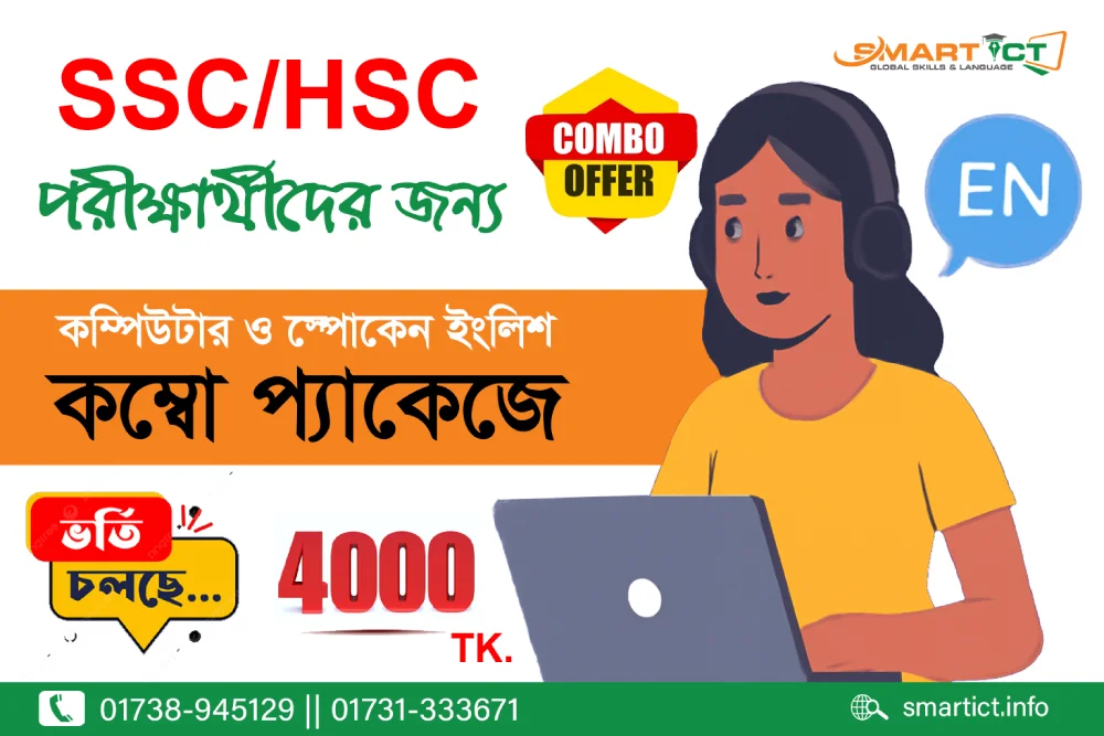 “কম্পিউটার ও স্পোকেন ইংলিশ কম্বো প্যাকেজ” বিশেষভাবে এসএসসি পরীক্ষার্থীদের জন্য ডিজাইন করা হয়েছে, যাতে একসাথে আধুনিক কম্পিউটার দক্ষতা এবং দারুন আত্মবিশ্বাসী ইংলিশ কথা বলার ক্ষমতা অর্জন করা যায়। আজকের প্রতিযোগিতামূলক শিক্ষাজগতে শুধু বইয়ের জ্ঞানই নয়, দক্ষ যোগাযোগ এবং কম্পিউটার দক্ষতা অপরিহার্য।
